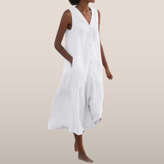 Luchtige mouwloze jurk met knoopsluiting en wijduitlopend silhouet, ideaal voor zomerse stranddagen of ontspannen vakanties.